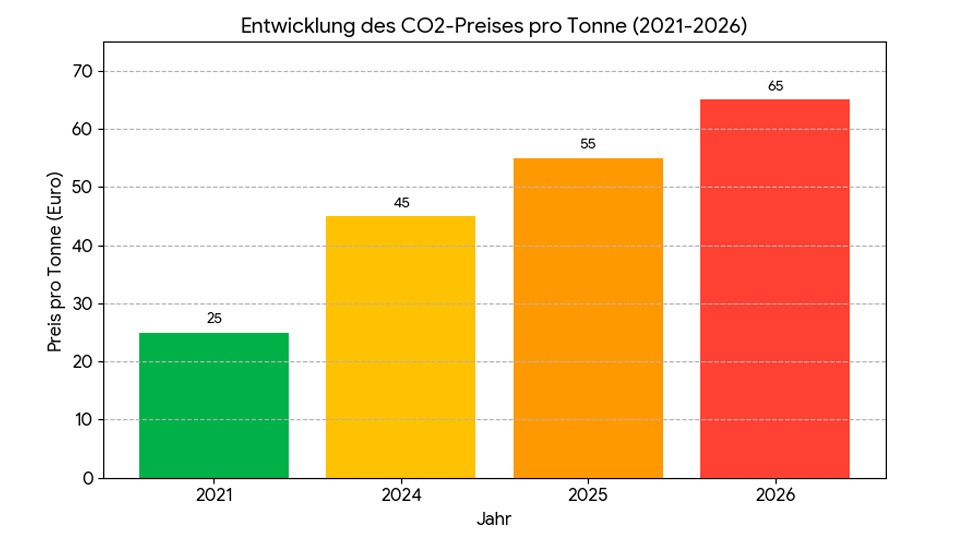 Der CO2-Preis, der auf fossile Brennstoffe wie Heizöl oder Erdgas erhoben wird, betrug 2022 noch 30 Euro pro Tonne CO2. Ab 2024 steigt dieser Preis auf 45 Euro pro Tonne und erreicht 2025 55 Euro pro Tonne. Diese Zusatzkosten werden vom Energieversorger berechnet und in der Energierechnung für den Gebäudeeigentümer ausgewiesen.